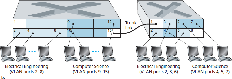 In the VLAN trunking approach, a special port on each switch (port 16 on the left switch and port 1 on the right switch) is configured as a trunk port to interconnect the two VLAN switches. The trunk port belongs to all VLANs, and frames sent to any VLAN are forwarded over the trunk link to the other switch. But this raises yet another question: How does a switch know that a frame arriving on a trunk port belongs to a particular VLAN? The IEEE has defined an extended Ethernet frame format, 802.1Q, for frames crossing a VLAN trunk. The 802.1Q frame consists of the standard Ethernet frame with a four-byte VLAN tag added into the header that carries the identity of the VLAN to which the frame belongs. The VLAN tag is added into a frame by the switch at the sending side of a VLAN trunk, parsed, and removed by the switch at the receiving side of the trunk. The VLAN tag itself consists of a 2-byte Tag Protocol Identifier (TPID) field (with a fixed hexadecimal value of 81-00), a 2-byte Tag Control Information field that contains a 12-bit VLAN identifier field, and a 3-bit priority field that is similar in intent to the IP datagram TOS field.