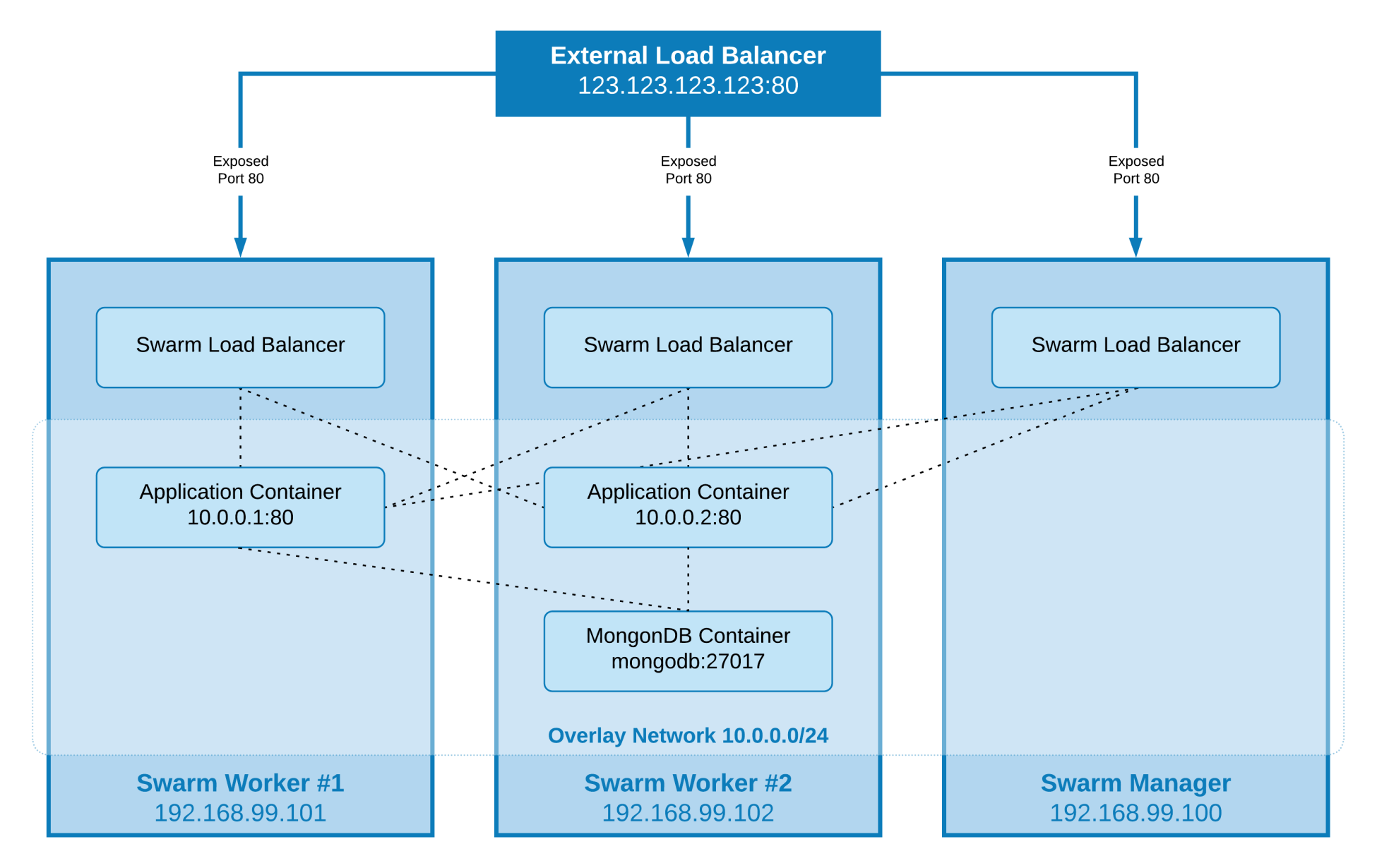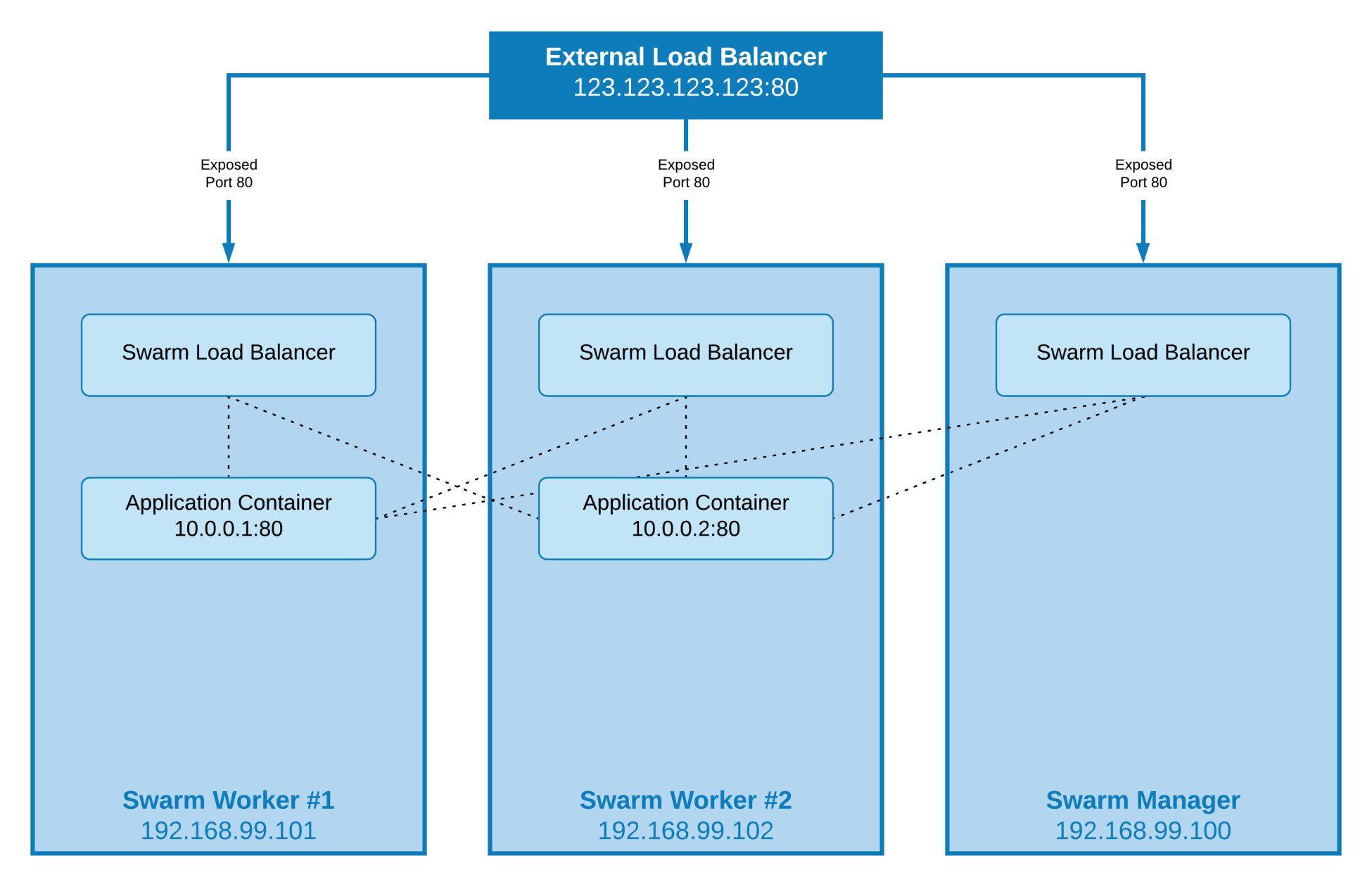Docker Swarm has an ingress load balancer built in, making it easy to distribute traffic to our public facing containers.